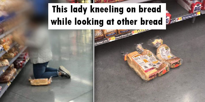 “This Lady Kneeling On Bread While She Looks At Other Bread”