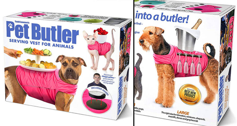 Impress yours guests at your next party by getting your pets to serve snacks and drinks. This Pet Butler Serving Vest is specifically designed for animals, allowing them to carry around almost any serving vessel with a flat bottom on their back. Now, common sense will tell you that the back of an animal isn’t the most stable surface to keep anything in place, let alone a bowl a or tray full of nibbles.