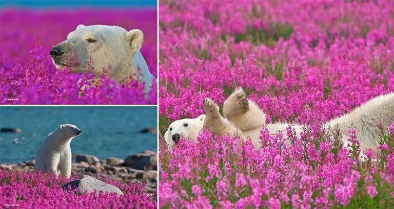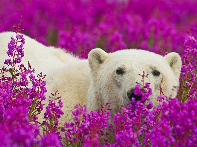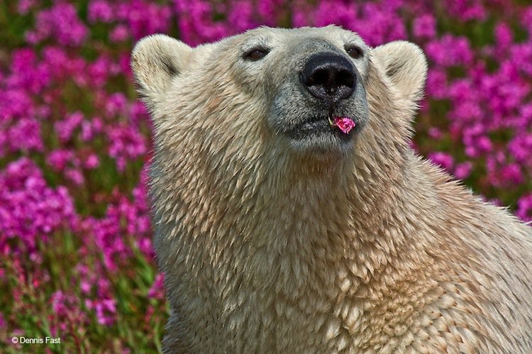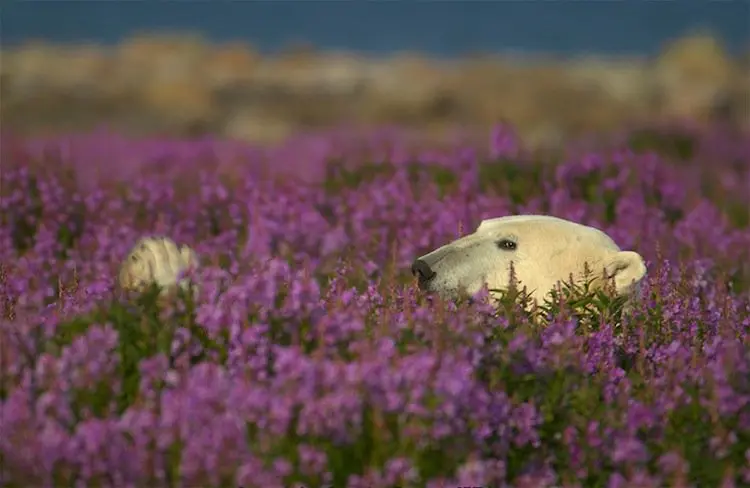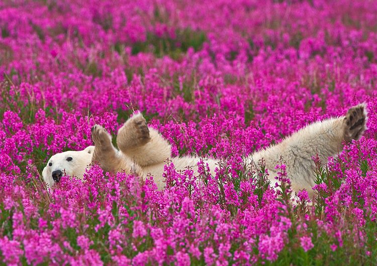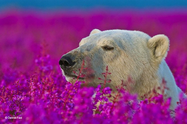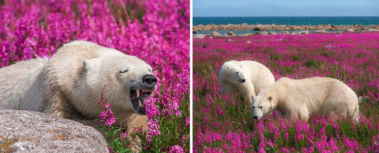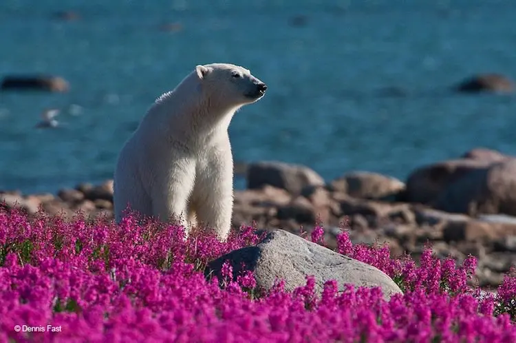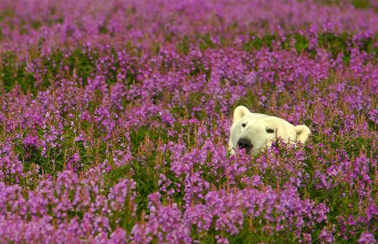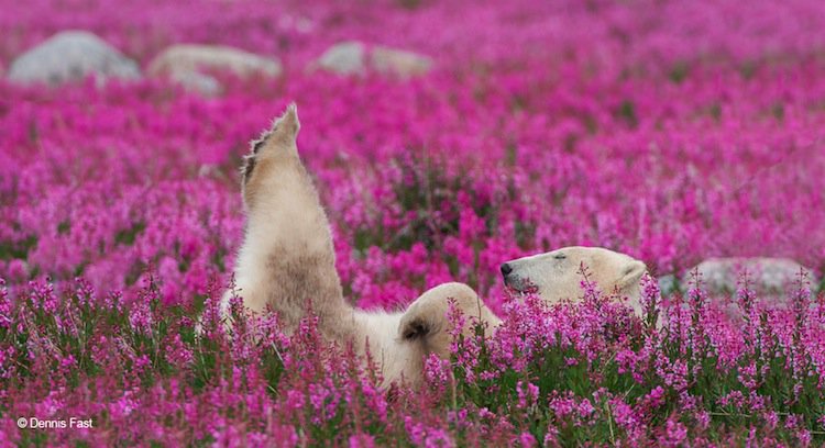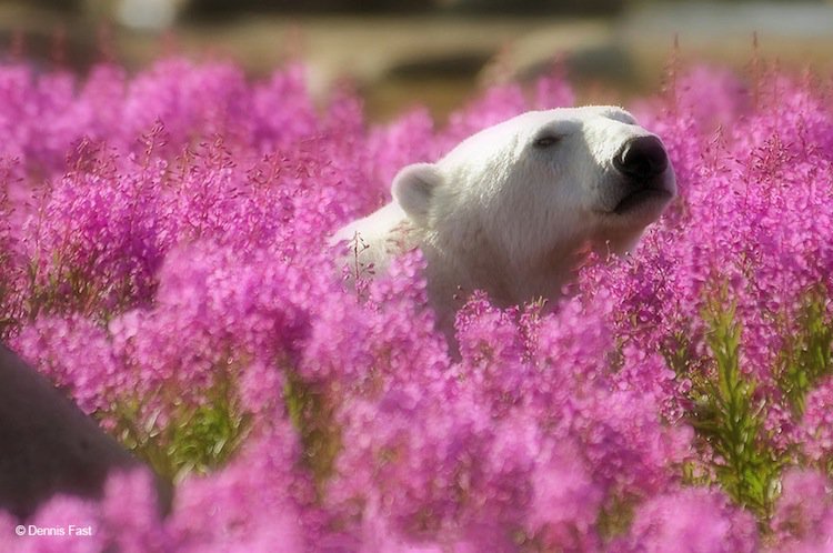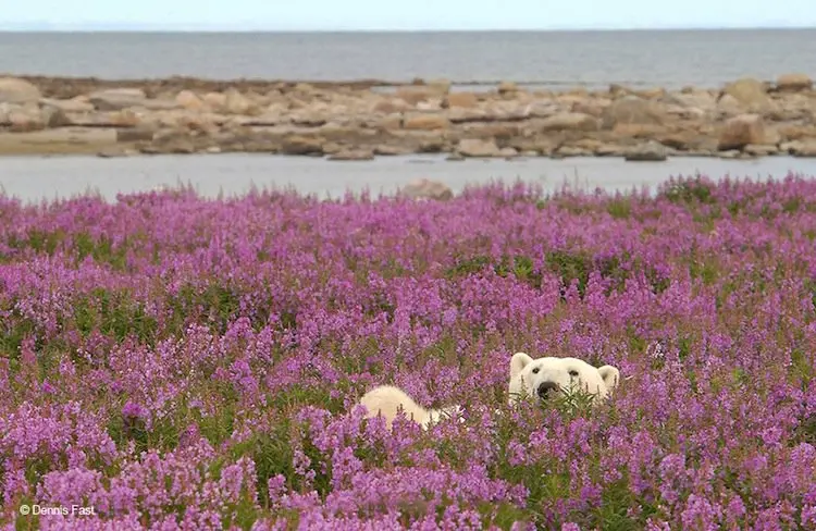 When you think of polar bears and their surrounds, one color comes to mind… white! We are so used to seeing polar bears in Artic or Antarctic environments, it's really strange and unique to see them frolicking about in fields of brightly colored flowers. Yet that's the amazing scene photographer Dennis Fast has captured below. These incredible shots were taken in Northern Canada's Hudson Bay, during the summer months, when the polar bears love to frolic in fields of fireweed. 'Most people are familiar with shots of polar bears in the ice and snow of Hudson Bay in Northern Canada and in other polar regions,' Fast told 'My Modern Met'. 'They are so ingrained in people's minds that you might think the North experiences only winter.' Fast loves the slow ambling gait of the polar bear, which moves as if it has not a care in the world. Take a look!