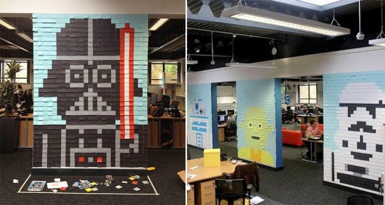 Most office walls around the world are pretty stark and boring. Workers are lucky if they get a standard print of a vase of flowers, or perhaps a benign landscape, to cheer them up during a tough day's toil. Yet employees at some companies are now fighting back against boring walls. How? By taking the ubiquitous Post-It note pad and putting it to good use, as a means of decoration. One such company doing just this is 'Viking', an office supply firm where staff recently created the most amazing Star Wars wall murals, using precisely 3579 Post-It notes. Characters depicted include Darth Vader, R2-D2, Yoda and a Storm Trooper. Take a look!