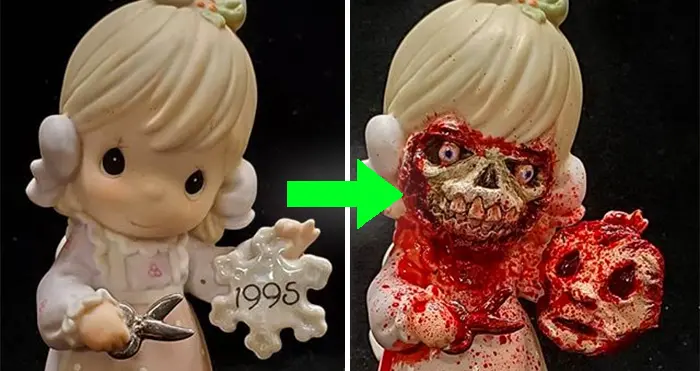 Keith Busher literally mutates innocent Precious Moments characters into gruesome monsters straight from your worst nightmare. He showcases his work on his website and Instagram account. The side-by-side images feature the before-and-after of his work and it is simply… heart stopping.