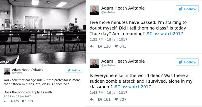 Many professors will be used to having a few students not turn up to class. Some for good reason, others for bad reasons, but either way it’s not a shock to have a small amount of pupils missing. However, here we have a professor who had an entire class not turn up! His name is Adam and he decided to live tweet the whole experience, which let’s face it, he had nothing better to do with his time! It makes for a highly amusing, although slightly upsetting, read. Take a look!