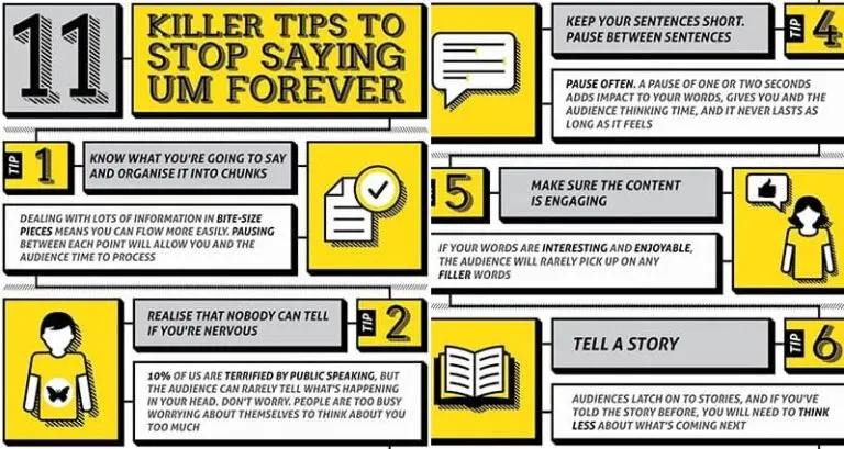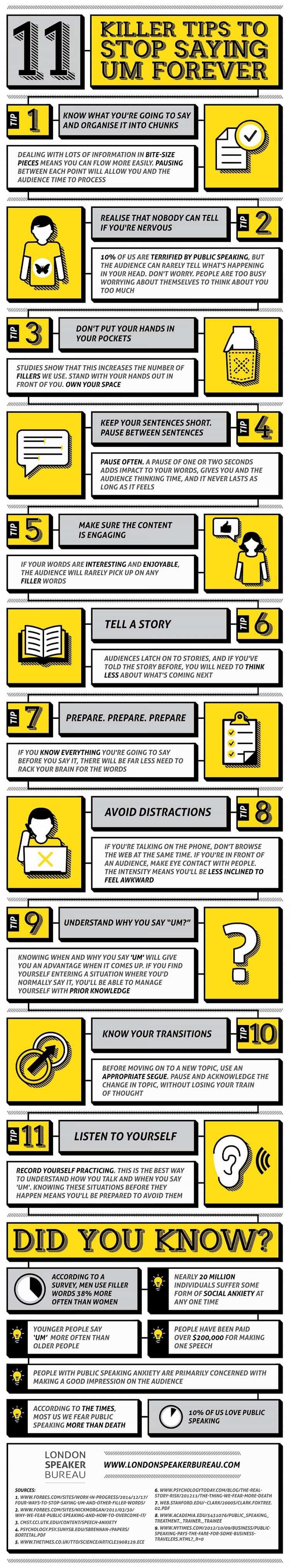 If you asked a random selection of people what they're afraid of doing, we're sure that the vast majority of them would mention public speaking. There are many reasons why people might not enjoy public speaking, one of them is that they're not confident about it and worry that they'll say 'um' and use other filler words. And, the fact is, that a lot of people do 'um' and 'ah' their way through any talk they're giving, but they don't have to! Luckily, the 'London Speaker Bureau' has come up with this handy infographic that will stop you using filler words, especially when engaging in public speaking. So, if you want to kill it at your next meeting or class presentation, read on!