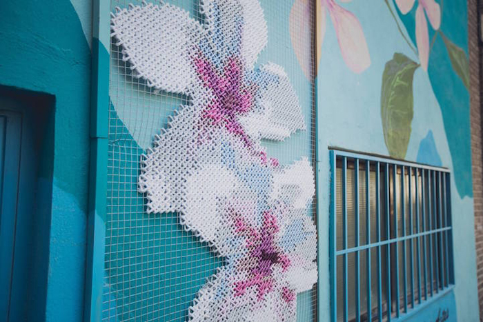 Rodrigo’s floral cross-stitch art installations are truly a sight to behold. She makes every piece by employing the traditional cross-stitch method. But instead of aida/evenweave fabric, she uses a large-scale wire mesh. And instead of floss/thread, she uses thick rope-like strings. She wraps the thick rolls of string around the wire mesh, much like in the traditional cross-stitching. The results are massive embroidery masterpieces that are installed on the façade of urban buildings.