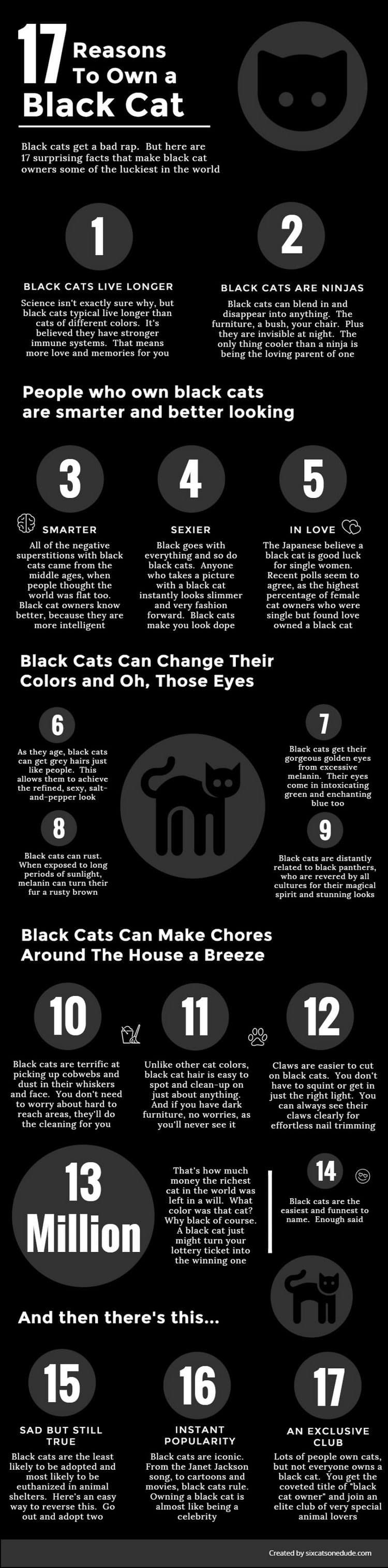 Black cats get a lot of bad press which is totally undeserved in our opinion. With Halloween coming up, black cat decorations and superstitions are all around us so we thought we'd fight back on behalf of black felines everywhere. Dave who runs the website 'Six Cats.One Dude' has created this awesome infographic which will illustrate why owning a black cat is one of the most amazing things ever! Take a look and let us know why you love your black cat in the comments below.