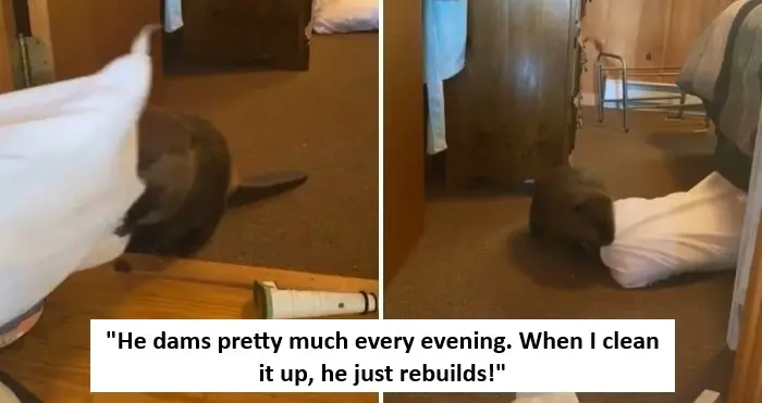 However, since Beave is staying indoors, his dam doesn’t consist of rocks, wooden sticks, leaves, and other natural materials. Instead, it features a variety of household items. From toys, pillows, shoes, towels to literally anything that he can get his teeth and paws on! So, lately, a typical day for Nancy consists of cleaning up a messy pile in the doorway due to Beave’s dam-building activity.