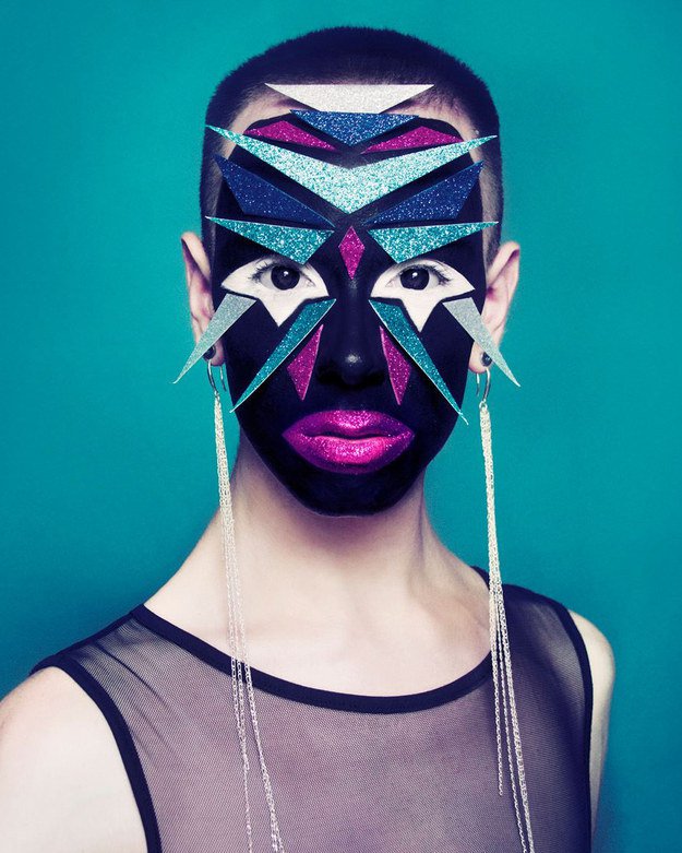 “I am inspired by symmetry, geometric shapes, drag culture, club culture, fashion, art, unconventional materials, patterns — anything really that alters my appearance and distorts my features. I’m not usually trying to look like a certain type of person or style or gender, even. For me it’s more about a color scheme and vibe that I wanna work with and how I can use makeup and materials to create a unique look.”