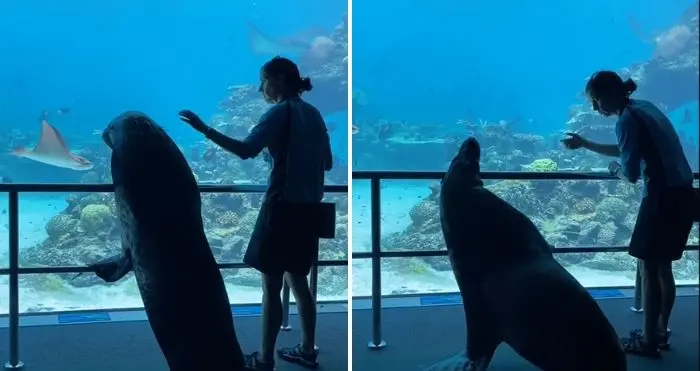 On March 28th, Sea World Australia uploaded a 59-second video of the trainer and Birri Junior visiting his scaly friends over at Shark Bay. The sight of hundreds of different fish swimming in the tank quickly caught his attention. Birri Junior was so fascinated that he couldn’t tear his gaze away from them! He even leaned onto the railing for a closer look. Then, at the end of clip, Erin is seen guiding Birri Junior to wave goodbye to his scaly friends and the diver in the tank. This short but sweet clip hooked over 161K views on Facebook.