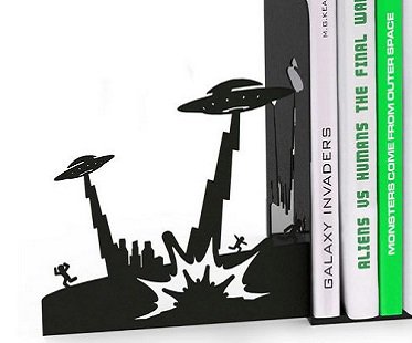 Organize your favorite sci-fi novels with these awesome alien invasion bookends! They'll look great displayed on a shelf in your home and will keep your books or DVD's neat and tidy.