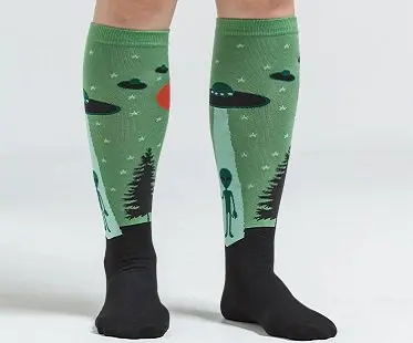 Everyday pieces of clothing don't have to be boring, so get yourself some of these fun alien socks! Their knee high length will keep your legs warm and they're perfect to wear with a pair of long boots. Fits women's shoe size of 5-10.