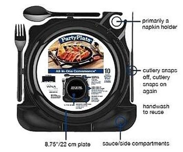 Everything you need in one piece! These all-in-one party plates have snap-off cutlery, 2 side compartments for dips and a ringed holder for napkins or stemware glasses! Heavyweight construction so no broken forks when your trying to eat! Perfect for parties, picnics or camping!