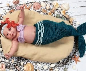 This hand made crochet knitted baby mermaid costume will look so cute on your baby you wont want to take it off again! Featuring a headband, bikini top and mermaid tail.