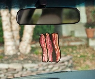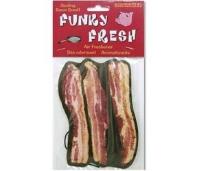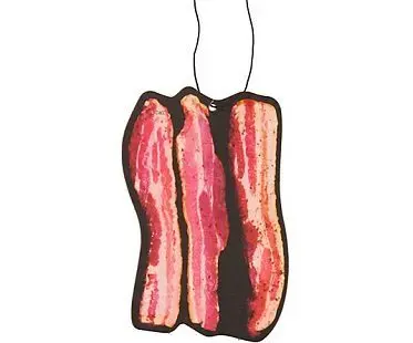 Take that delicious smell with you everywhere you go with this tasty bacon air freshener! It features a handy string for hanging so it's perfect to use in the car. Makes a hilarious gift for bacon lovers!