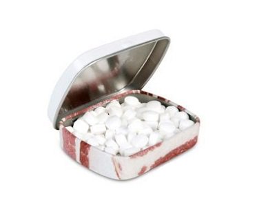 Refresh your breath with a cooling minty salty taste with these bacon flavored mints! Perfect for when you're craving those sizzling strips of goodness but are trying to cut back on the calories. Tastes just like the real thing- with an added touch of fresh mint! Tin contains around 100 mints.