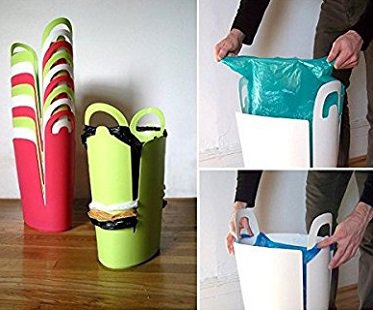 Put those gathered supermarket grocery bags to good use with this bag storing trash can! Once you've been shopping, you can reuse the bags around the house for waste while saving money at the same time. Simply hook the handles over the arms and push them down ready for future use.