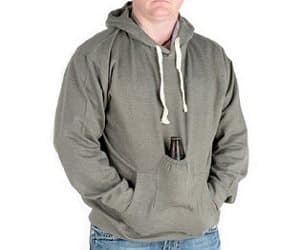 Keep your hands free and your beer safe wearing this beer pouch hoodie! Lined and insulated pocket holds bottle and keeps it cold. Also fits soda cans.