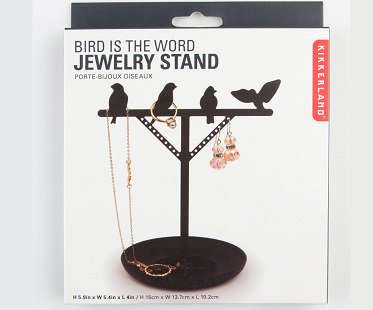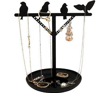 Display your pretty possessions in style with this bird jewelry stand! Its clever design makes it look like the birds are perched on a pole! There's plenty of room to put your pieces onto; use the top to hang necklaces, the holes to hold earrings and the bottom tray to store rings, brooches or a watch.