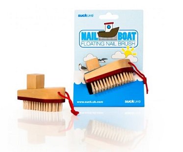 Sail your way to ship-shape and clean nails with this handy boat nail brush! It's perfect for scrubbing dirt and hidden germs away from you fingers and nails. Floats in the bath and features a red cord for hanging.