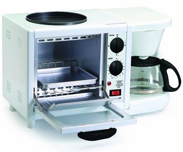 Start your mornings with this 3 in 1 breakfast Maker! Enjoy coffee, toast and eggs all prepared by one space saving appliance. The oven has a 15 minute timer, temperature control setting and indicator light. The coffee maker has a 4-cup capacity, swing-out filter compartment and pause ‘n serve anti-drip feature. The griddle has a 6-inch diameter frying griddle and uses energy and heat from toaster oven and is perfect for frying eggs and other breakfast foods.