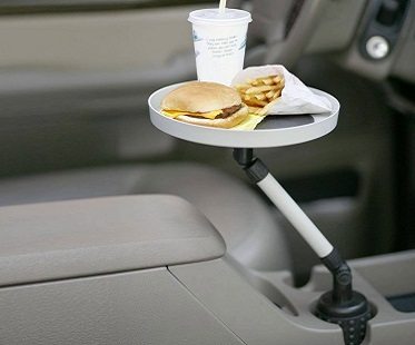 Keep your food at the tip of your fingers while on-the-go with this car swivel tray! It easily fits into your cup holder and locks into place securely preventing any accidental spills. Use it to hold your food, pens, paper or other bits and bobs while driving.