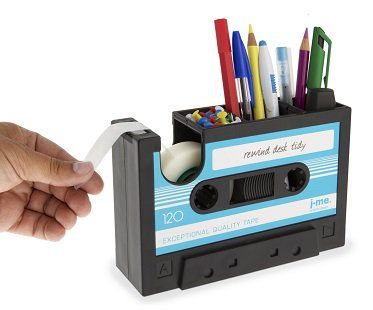 Add a retro touch to your workspace with this cassette tape desk tidy! It will provide storage for up to 30 pens or pencils and also includes a sticky tape dispenser with 1 roll.