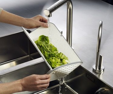 This chopping board and colander is a must-have for every kitchen! It folds and locks into a colander so you can rinse your food. Open the board flat and you have a non-slip chopping board. You can then fold the board again to create a chute which chopped food or waste can be poured from. Different colors available.