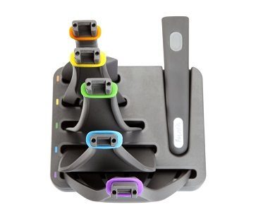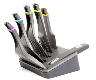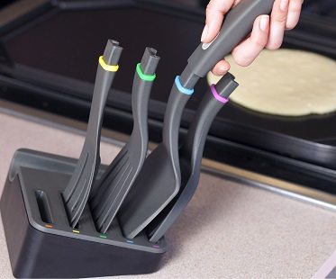 Add some modern convenience to your kitchen with this click and cook spatula set! This system includes one ergonomic handle that easily attaches to the required utensil with a simple click. It's a great space saver for your kitchen counter and eliminates clutter. Set includes: a long flexible slotted spatula, a flat spatula, an extra-wide slotted spatula, a flexible mixer and a slotted spoon.