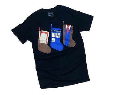 Get ready for the Who-lidays with this very festive Doctor Who Christmas stockings T-shirt! Features a fun print of three different time lord-themed stockings: Tardis, tenth doctor and eleventh doctor.