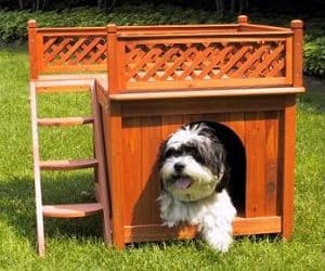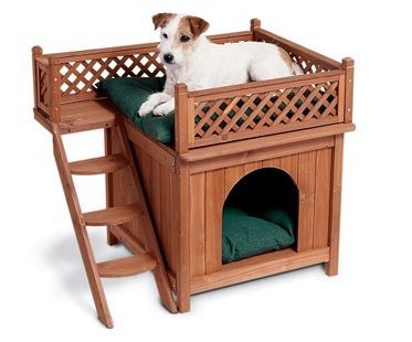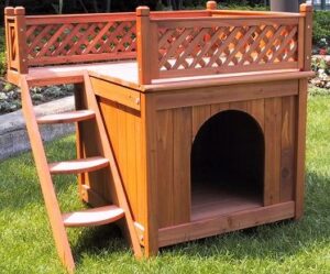 This grand looking dog house with its beautiful brown cedar colored lattice fence will sit rather nicely in or outside your home. The steps along the side of the dog house lead up to a roof top balcony where your pooch can take in sunshine!