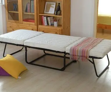 This awesome folding ottoman bed serves two purposes. It's great as a regular ottoman by day… then by simply removing the cover and unfolding the metals frame it serves as a bed by night! Includes mattress and machine washable cover.