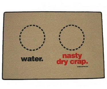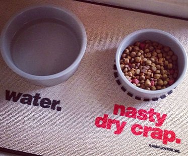 Amuse yourself every time you feed your cat or dog with this funny pet food mat! It features a place for their water bowl and a place for their 'nasty dry crap' food bowl! Fun and functional for homes with pets.