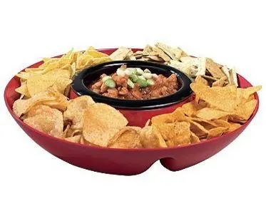 Enjoy some warm queso with your favorite snacks using this heated chip and dip tray! It's a must-have for movie nights or parties and it's also great to use to melt chocolate for marshmallows or fruit. You can even use it for cold dips by removing the heated base. YUM!