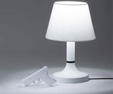 Bring some modern and fun style into your home and get one of these awesome lamps with gun remote control! Point and shoot the lamp to turn it on and off. When it turns off, the lamp will tilt to the side to show it's been shot. When you shoot it again, it will rise slowly and light up. Awesome!