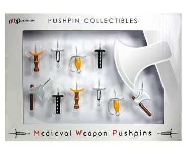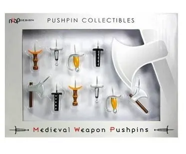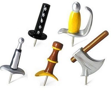 Stab your memos with these medieval weapon push pins! They're fun and functional to use on bulletin or cork boards whether they're in the office or right at home. Includes 2 of each of these weapons: single handed sword, sabre, katana, axe and broadsword.