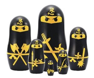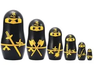Here's a modern take on an old classic! These ninja nesting dolls will look awesome displayed in your home! Line them up on a shelf and use them for storing small items inside. Each doll is armed and ready with their own weapon should they need to bust out some ninja moves.