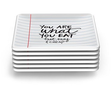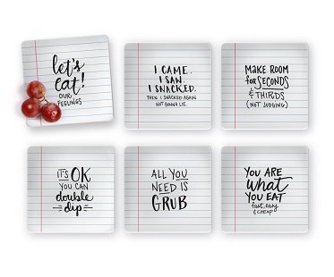 Pass little messages around at your next party and get these notes appetizer plates! They're fun to use and are perfect for bites and nibbles at your next get together. Set includes 6 plates with a different note on each.