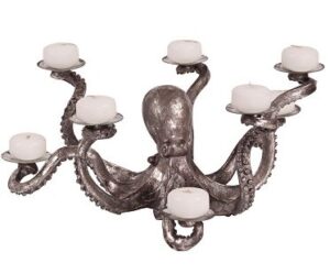 Get yourself an eye-catching centerpiece for your home with this octopus candle holder! It features a flat disk on the end of each leg that can hold a pillar or votive candle. A great antique piece that would suit the traditional tastes of home decor.