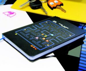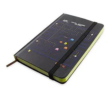Jot down your notes it true retro style with this awesome Pac-Man notebook! Features 73 pages of lined paper with Pac-Man appearing on every right hand sheet. There's also a blue ribbon bookmark so you can keep your place and an elastic holder to keep it all together.