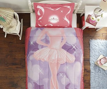 Your little dancer will love being center stage when she climbs into her pink ballerina bedding set! It's a comforter and pillow that feature printed graphics in girly pink and purple colors. Bedtimes will be a stress-free breeze!