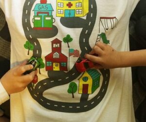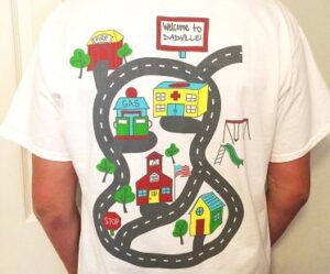 Now dad can relax and get a free massage while the kids play on the play mat T-Shirt! It comes complete with two toy cars so they can drive it around the track while dad lays flat on the floor. Genius!
