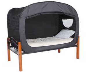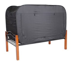 From the website where it's being sold: The innovative tent that fits around a bed and provides privacy in shared rooms. Create a private space to sleep and relax in with the Privacy Pop Tent. This pop up tent is a versatile choice that can be easily added and stored away.