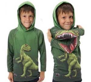 This brilliantly designed raptor hoodie forms the head of a prehistoric dinosaur when one elbow is crossed over the other. Available in a range of sizes including adult sizes! So you too can play dinosaur with the kids. Awesome!