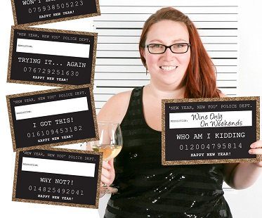 It's never too late to set yourself some goals for the year, so get these resolutions mug shot signs and start working on those targets! Whether it's to cut back on wine or lose those holiday pounds, these signs will certainly make your goals more fun, even if they're too difficult to achieve! Includes 20 signs which is plenty for you and your friends.