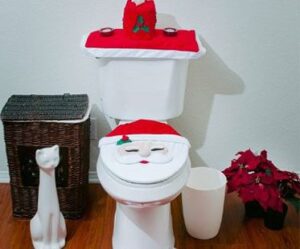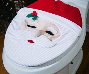 Bring the Christmas spirit with you to the bathroom. This set includes a Santa Claus toilet cover, tank cover, rug with anti-slip back and a tissue box cover. seat and tank cover have elastic for a snug fit.