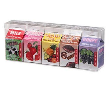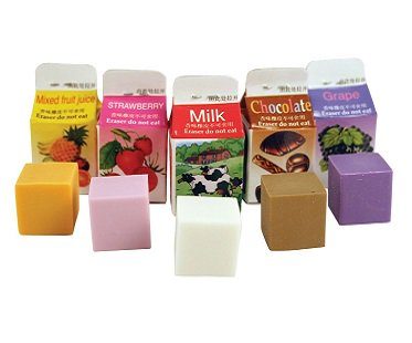 You'll be the envy of your friends at school when you pull out these scented erasers in milk cartons! They're fun to have and will come in handy when you make mistakes on your work! There are five different yummy scents: strawberry, grape, chocolate, fruit juice and milk. Your classmates will all be asking if they can borrow them!