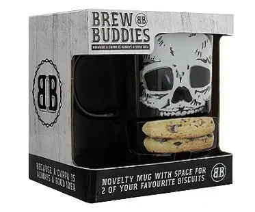 It's all about this skull biscuit mug at tea time! Enjoy your preferred brew along with 2 of your favorite biscuit treats tucked inside the pocket at the bottom. Features an awesome skull design and makes a great gift idea.