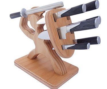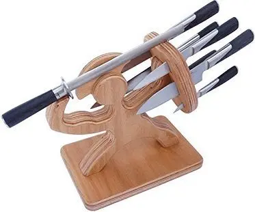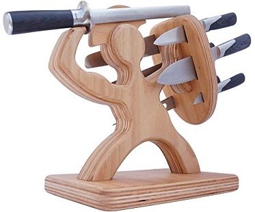 Display your knife collection the awesome way with this Spartan knife block! It features a Greek warrior holding a shield with one hand and a knife sharpener as his weapon in the other hand. The shield has slots for your knives making the overall design look clever. Made from maple wood.