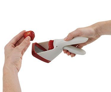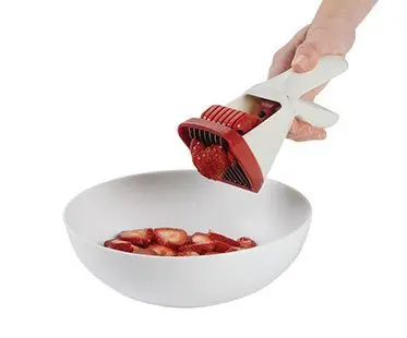 Slicing strawberries has never been so easy with this strawberry slicer! Simply place a strawberry into the slicer, grip and press the handle down, job done! Its safe, its easy and above all brilliant! Made with stainless steel blades which are also perfect to cut through other things like mushrooms.