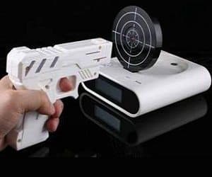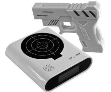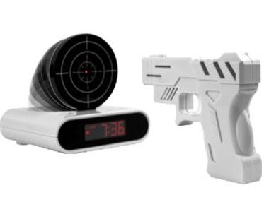 Tough time getting out of bed in the morning? Ever feel like shooting your alarm clock for a few more minutes of precious sleep? Now you can start the day with a bang with the Gun and Target Recordable Alarm Clock! Gun uses infrared and fires with sound effects, You can even record your own alarm sounds!