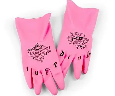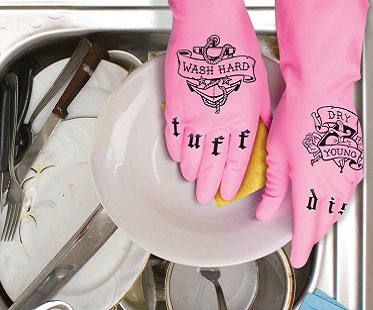 Make your washing up chores more interesting with these hilarious tattooed dish gloves! You can really show your dishes who's boss with these fun yet practical gloves. Made from latex material with flocked lining for easy removal.